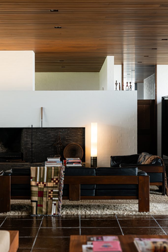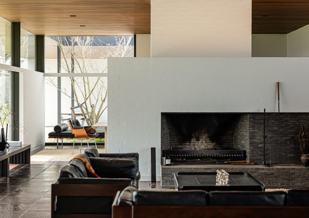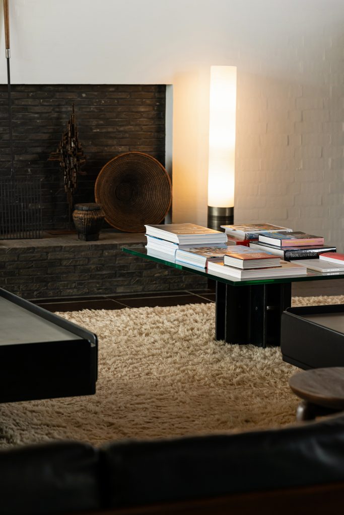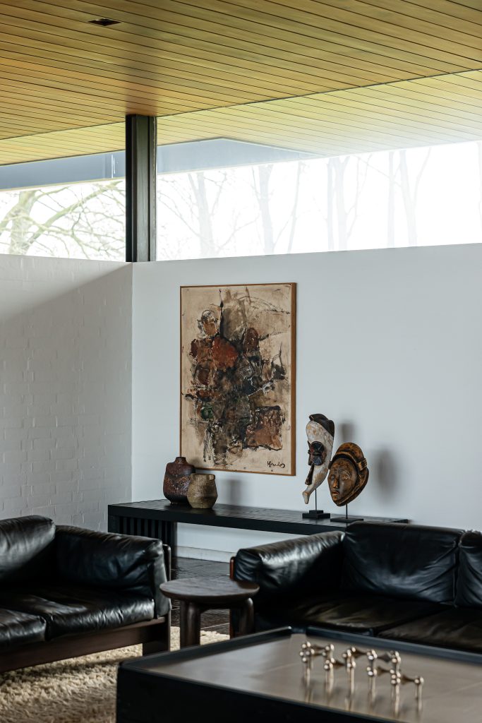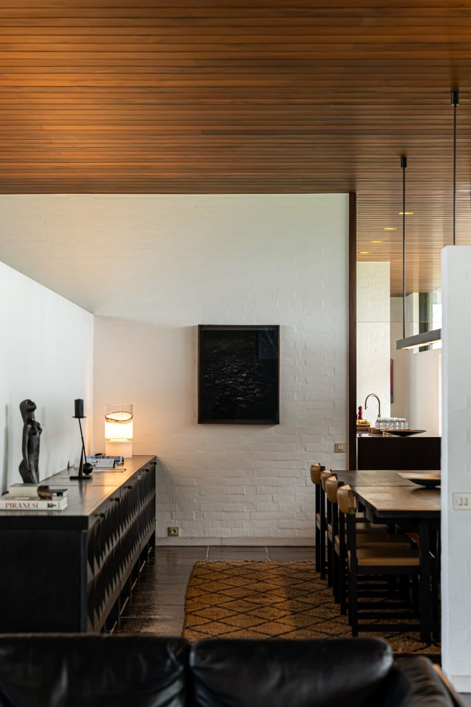 Nội thất của biệt thự là sự kết hợp hài hòa giữa tinh thần hiện đại chủ nghĩa giữa thế kỷ và sự tinh tế đương đại. Phòng khách nổi bật với sofa Bastiano của Afra & Tobia Scarpa, với lớp vải len xám mang những vết lõm nhẹ, ghi dấu thói quen sinh hoạt của gia chủ. Nhà bếp, được thiết kế lại bởi Lore De Baere và Edward Weysen, là một điểm nhấn với gỗ gụ châu Phi kết hợp cùng mặt bàn thép không gỉ, tạo nên sự cân bằng giữa ấm áp và sắc nét. Thiết kế mô-đun của nhà bếp không chỉ tiện dụng mà còn là một lời tri ân tới di sản hiện đại chủ nghĩa của ngôi nhà.
