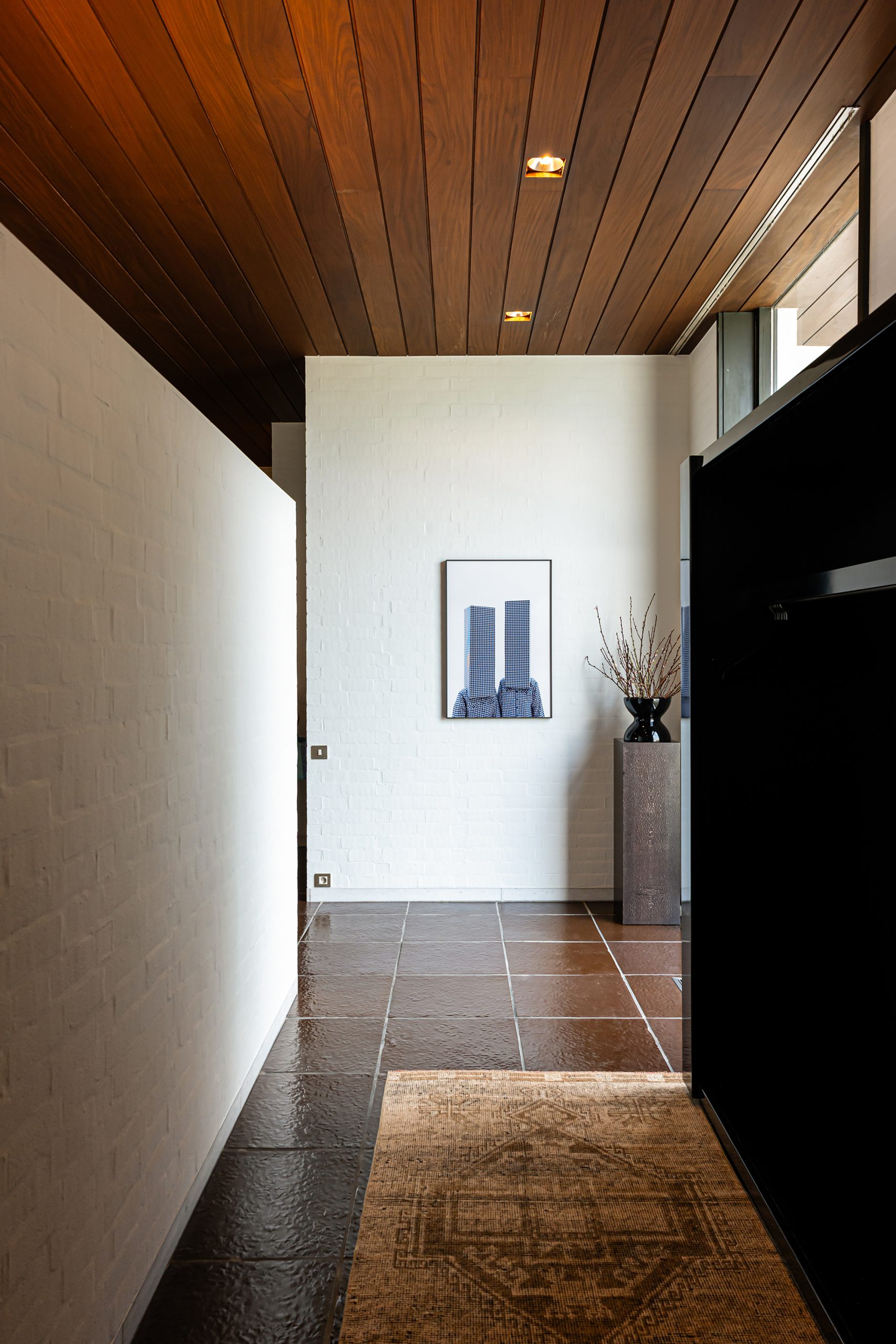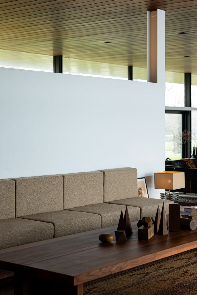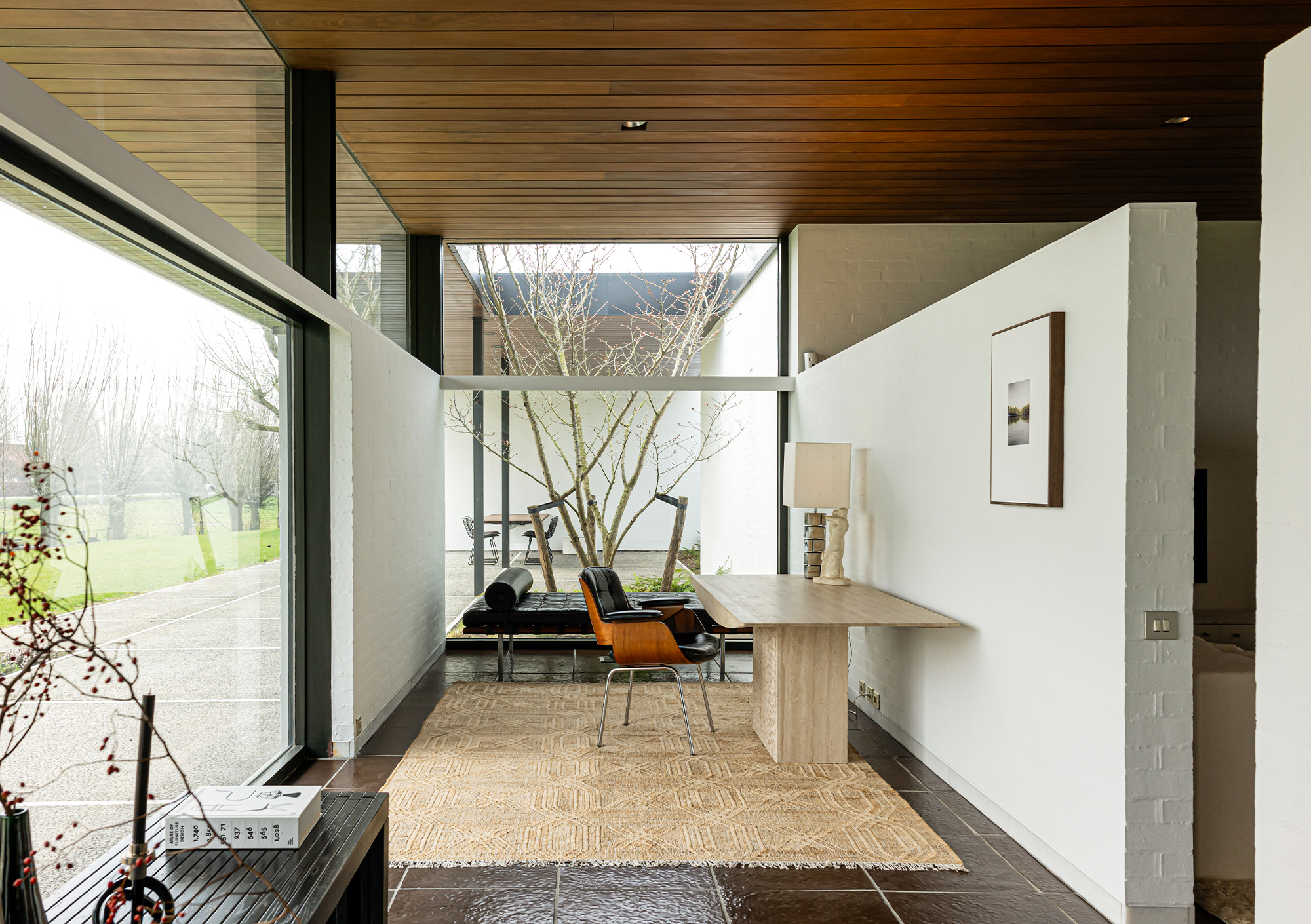 Nội thất của biệt thự là sự kết hợp hài hòa giữa tinh thần hiện đại chủ nghĩa giữa thế kỷ và sự tinh tế đương đại. Phòng khách nổi bật với sofa Bastiano của Afra & Tobia Scarpa, với lớp vải len xám mang những vết lõm nhẹ, ghi dấu thói quen sinh hoạt của gia chủ. Nhà bếp, được thiết kế lại bởi Lore De Baere và Edward Weysen, là một điểm nhấn với gỗ gụ châu Phi kết hợp cùng mặt bàn thép không gỉ, tạo nên sự cân bằng giữa ấm áp và sắc nét. Thiết kế mô-đun của nhà bếp không chỉ tiện dụng mà còn là một lời tri ân tới di sản hiện đại chủ nghĩa của ngôi nhà.