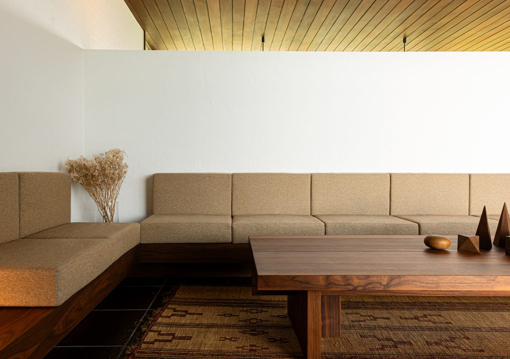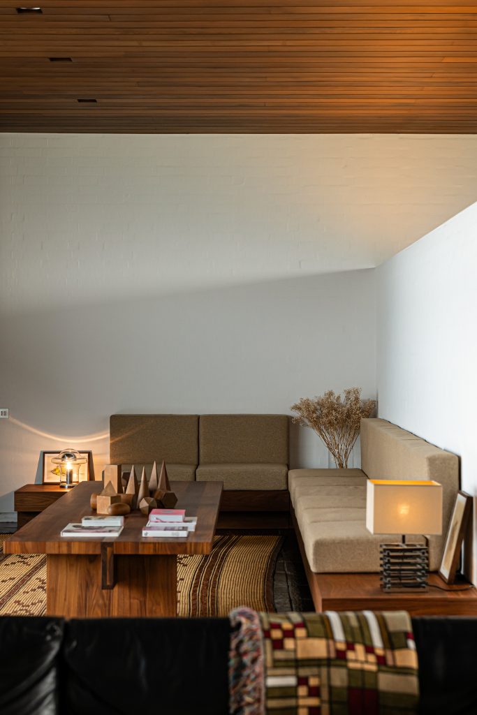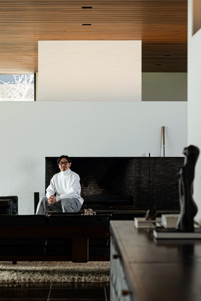 Ánh sáng là linh hồn của biệt thự. Vào buổi sáng, ánh nắng nghiêng chiếu qua các ô kính, tạo nên những bóng hình học sắc nét trên thảm lông dài màu be trong phòng khách. Khi hoàng hôn buông xuống, ánh sáng từ phía tây xuyên qua các bức tường gạch kính, nhuộm không gian nội thất sắc hổ phách ấm áp. Đèn Banxton x Civilian H02 rose knot tạo ra những bóng đổ tinh xảo, trong khi sàn gỗ sồi Evener, với kết cấu được hoàn thiện sẵn, trở nên sống động, gần gũi dưới ánh sáng chiều tà. Những vách ngăn nửa chiều cao trở thành khung tranh tự nhiên, lưu giữ từng khoảnh khắc ánh sáng như một bản phác thảo của Rembrandt.