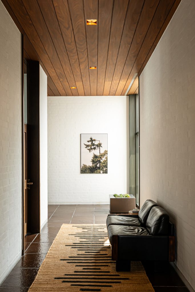 Bước vào biệt thự, cảm giác đầu tiên là sự giao thoa giữa mùi gỗ và bụi cẩm thạch, phả nhẹ qua cánh cửa tưởng nặng mà hóa ra nhẹ nhàng. Hành lang với những vách gạch trắng dẫn lối, mở ra không gian sống động, nơi ánh sáng và vật liệu kể những câu chuyện riêng. Trong sân trong, mặt nước hồ bơi phản chiếu ánh nắng, tạo nên những hoa văn ánh sáng chuyển động trên tường trắng, gợi lên hình ảnh Georges Vandenbussche – người có lẽ từng ngồi đây, trầm ngâm trước sự giao thoa của kiến trúc và thời gian.