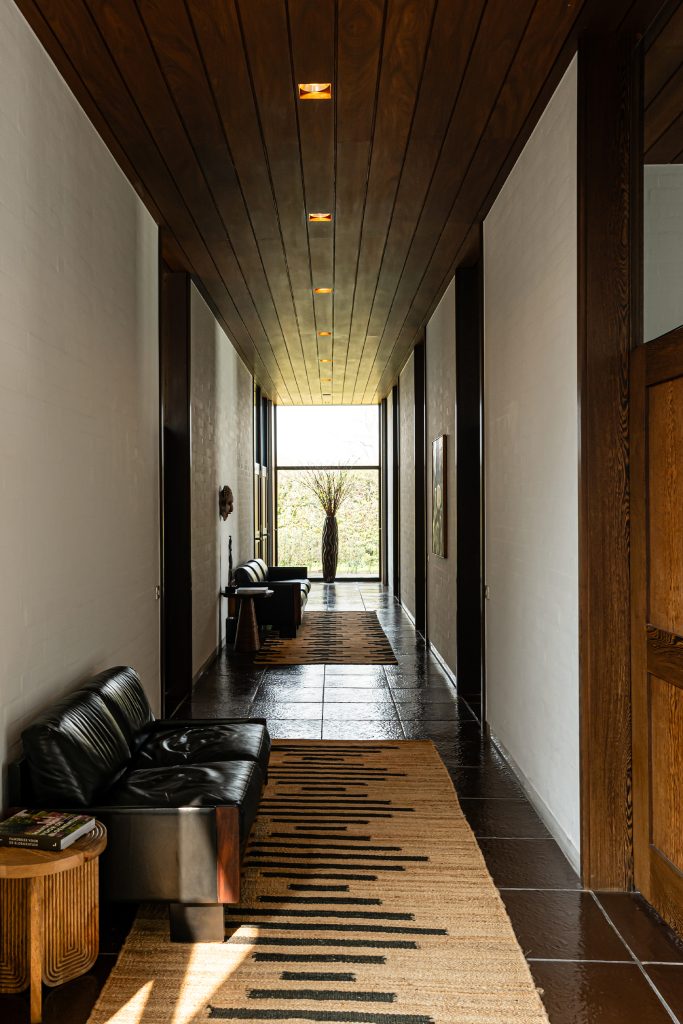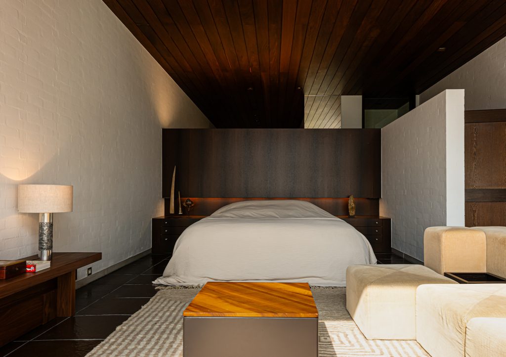 Mỗi không gian trong biệt thự là một trải nghiệm thị giác và xúc giác. Sàn gỗ sồi, thảm lông dài, và các bề mặt bê tông đều mang lại cảm giác chân thực, gần gũi. Ánh sáng, từ những tia nắng ban mai đến sắc hổ phách hoàng hôn, không chỉ chiếu sáng mà còn định hình cách không gian được cảm nhận. Các vách gạch kính và chi tiết nội thất, như đèn Banxton, trở thành những yếu tố kiến trúc vừa chức năng vừa nghệ thuật, tạo nên một không gian vừa tĩnh lặng vừa sống động.