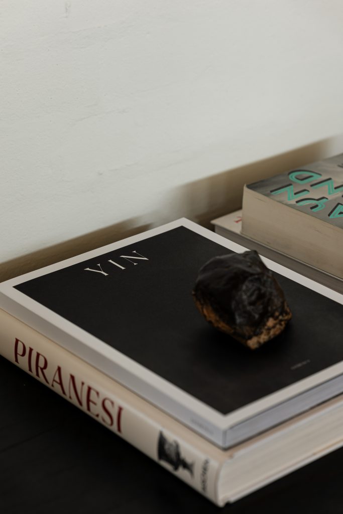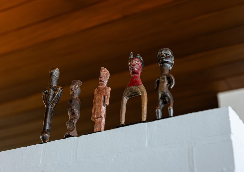 Tại lối vào, một bức tranh trừu tượng khổng lồ với sắc xanh coban và đỏ ochre như một hợp âm thị giác, hòa quyện cùng các vật dụng nhỏ trên tủ đen: một món trang trí đồng thau loang lổ, vài viên pha lê bất quy tắc và một bức tượng thu nhỏ mang dáng dấp mặt nạ bộ lạc châu Phi. Những chi tiết này, dù ngẫu nhiên, mang lại sự ấm áp và cá tính cho không gian.
