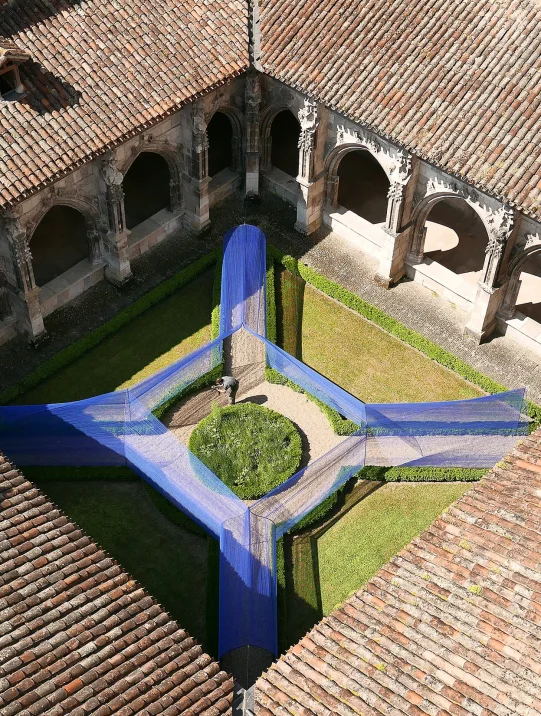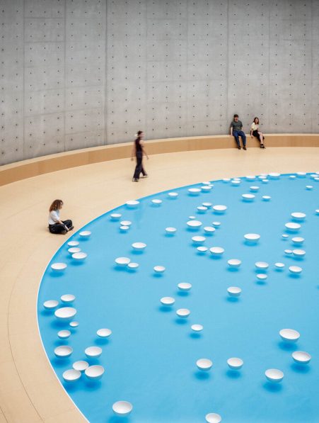 Một bể nước đường kính 18m phản chiếu bầu trời Paris qua mái vòm bảo tàng, với các bát sứ trôi nổi va chạm ngẫu nhiên, tạo giai điệu bất ngờ.