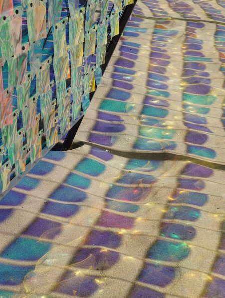 Một bể nước đường kính 18m phản chiếu bầu trời Paris qua mái vòm bảo tàng, với các bát sứ trôi nổi va chạm ngẫu nhiên, tạo giai điệu bất ngờ.