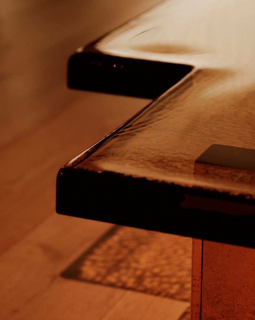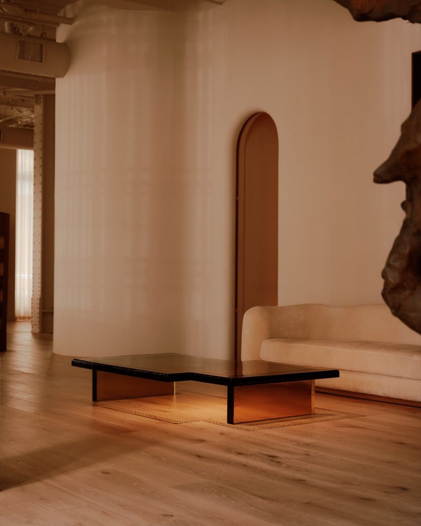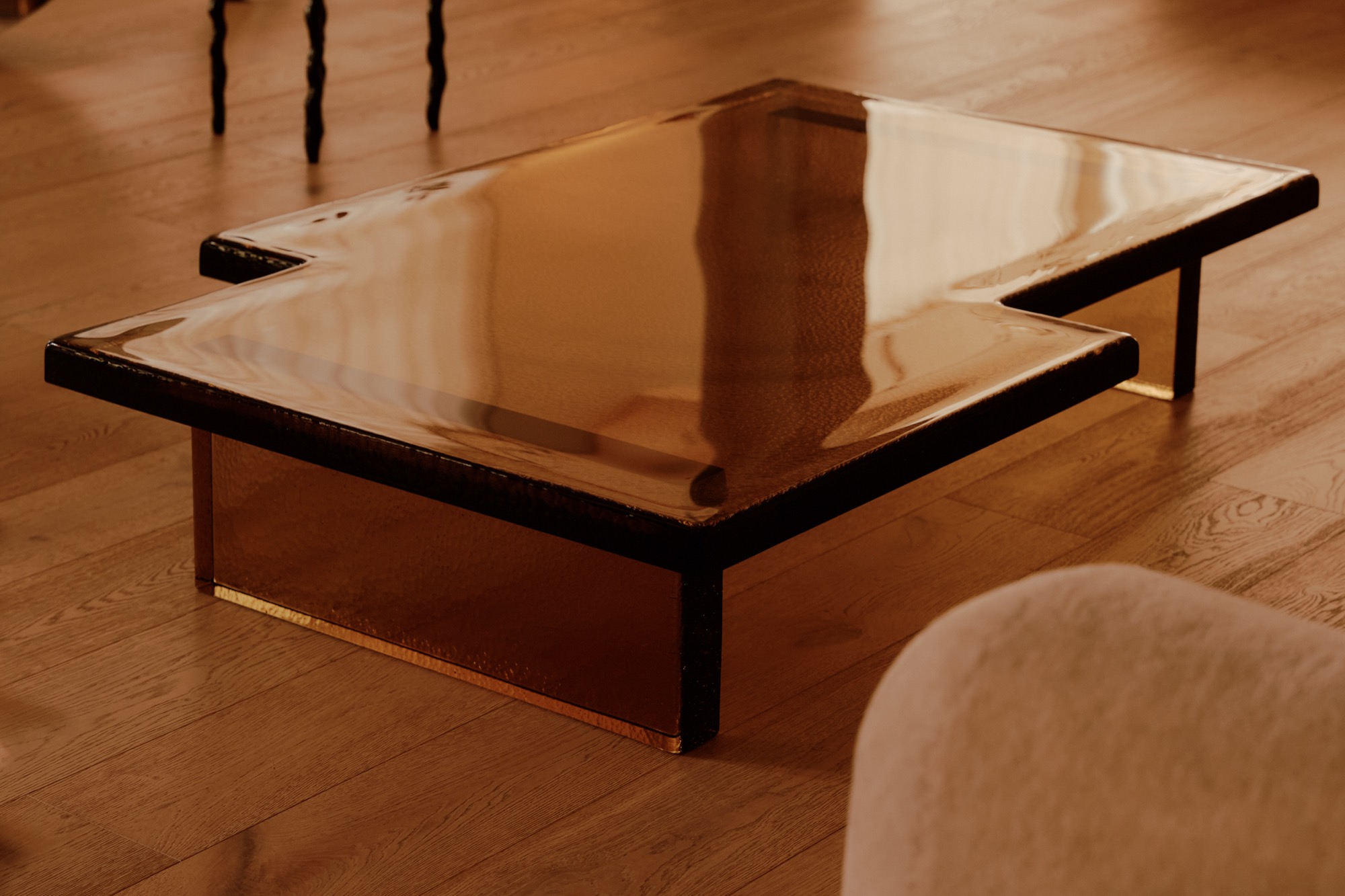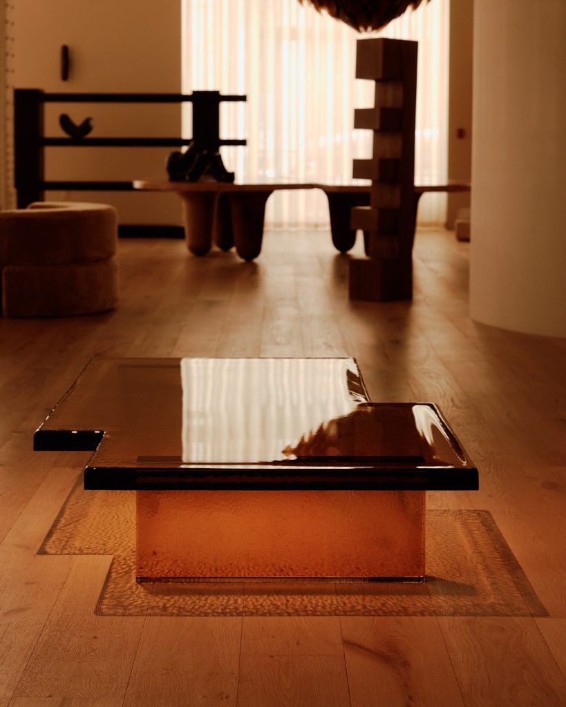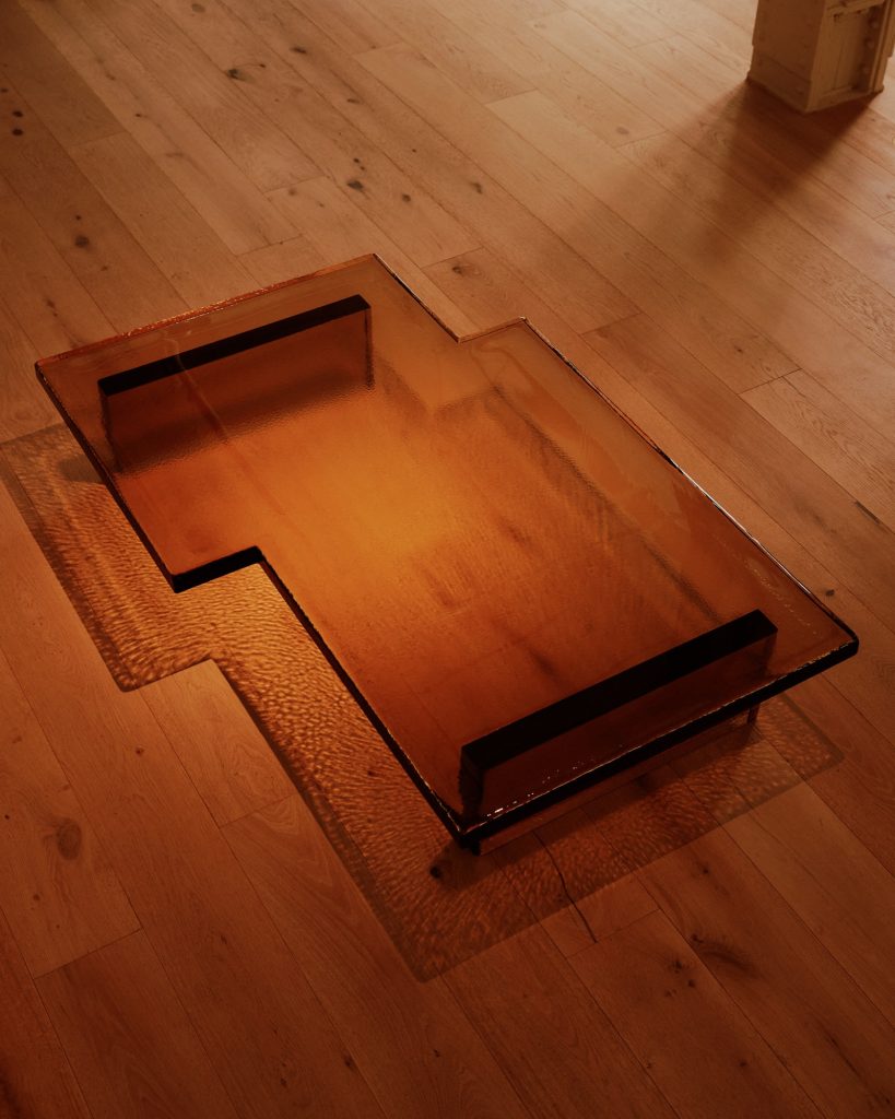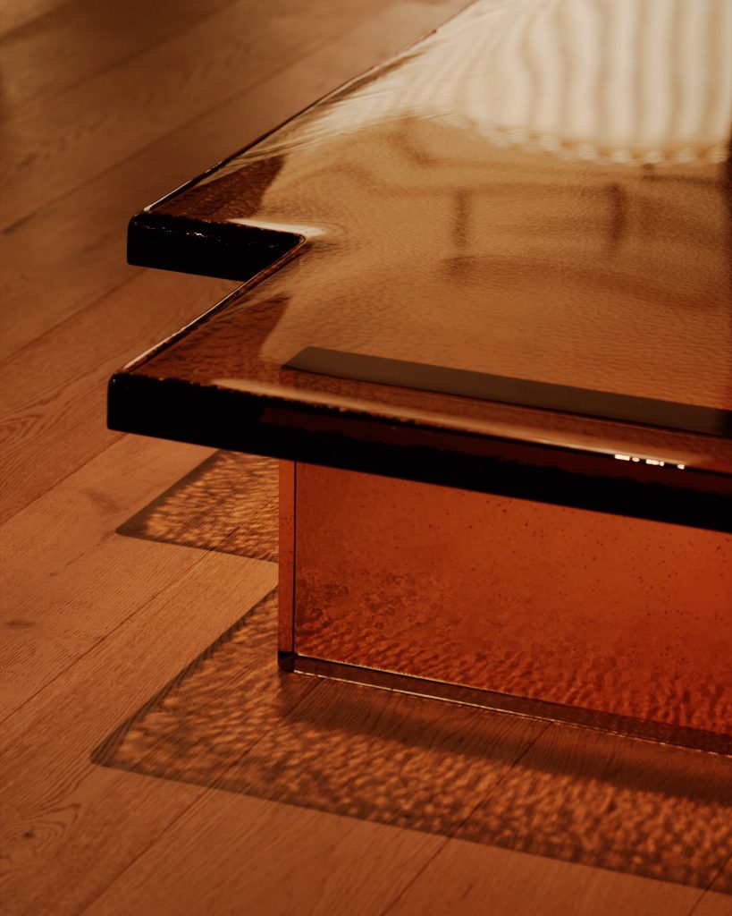Cử chỉ ấy phản ánh rõ tinh thần của bộ sưu tập nội thất đầu tay vừa ra mắt ngày 30/6 cùng STUDIOTWENTYSEVEN. Gồm tám món đồ, từ bàn ăn, bàn trà, console đến bàn cạnh, bộ sưu tập là một nghiên cứu súc tích và tinh tế về chất liệu, hình khối và công năng. Từng món được đúc thủ công tại Oakland với sắc độ đa dạng: xám khói, đen mờ, băng trong, đồng ánh topaz hay xanh cobalt điện tử. Như Lonstein mô tả, thủy tinh trong bộ sưu tập không còn là vật liệu phụ, mà trở thành nhân vật chính – một cấu trúc ánh sáng, một không gian biết thở.