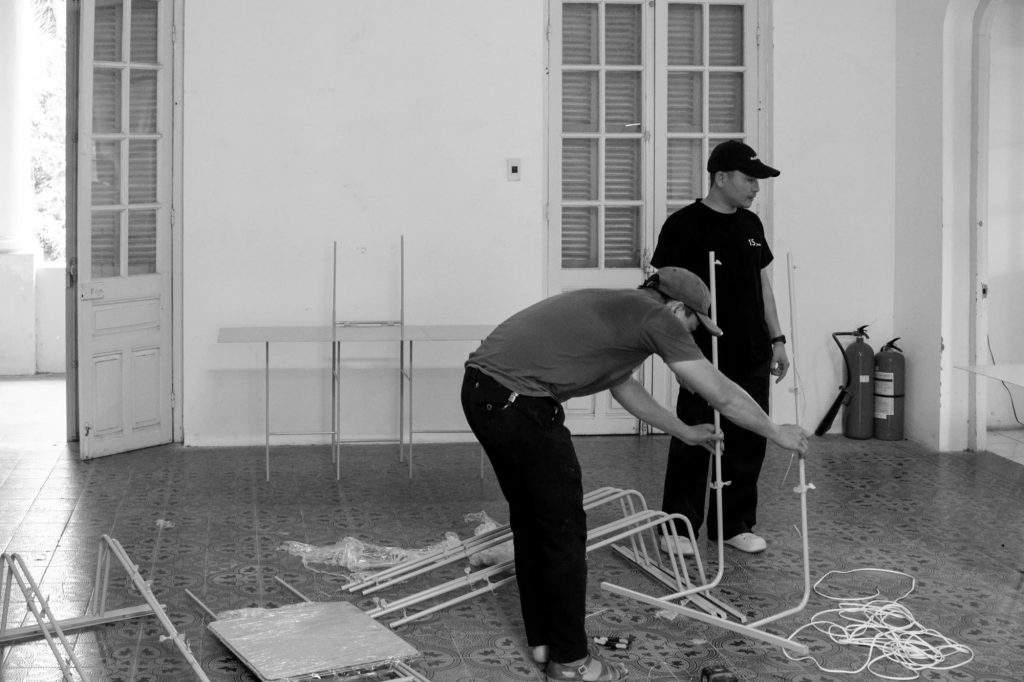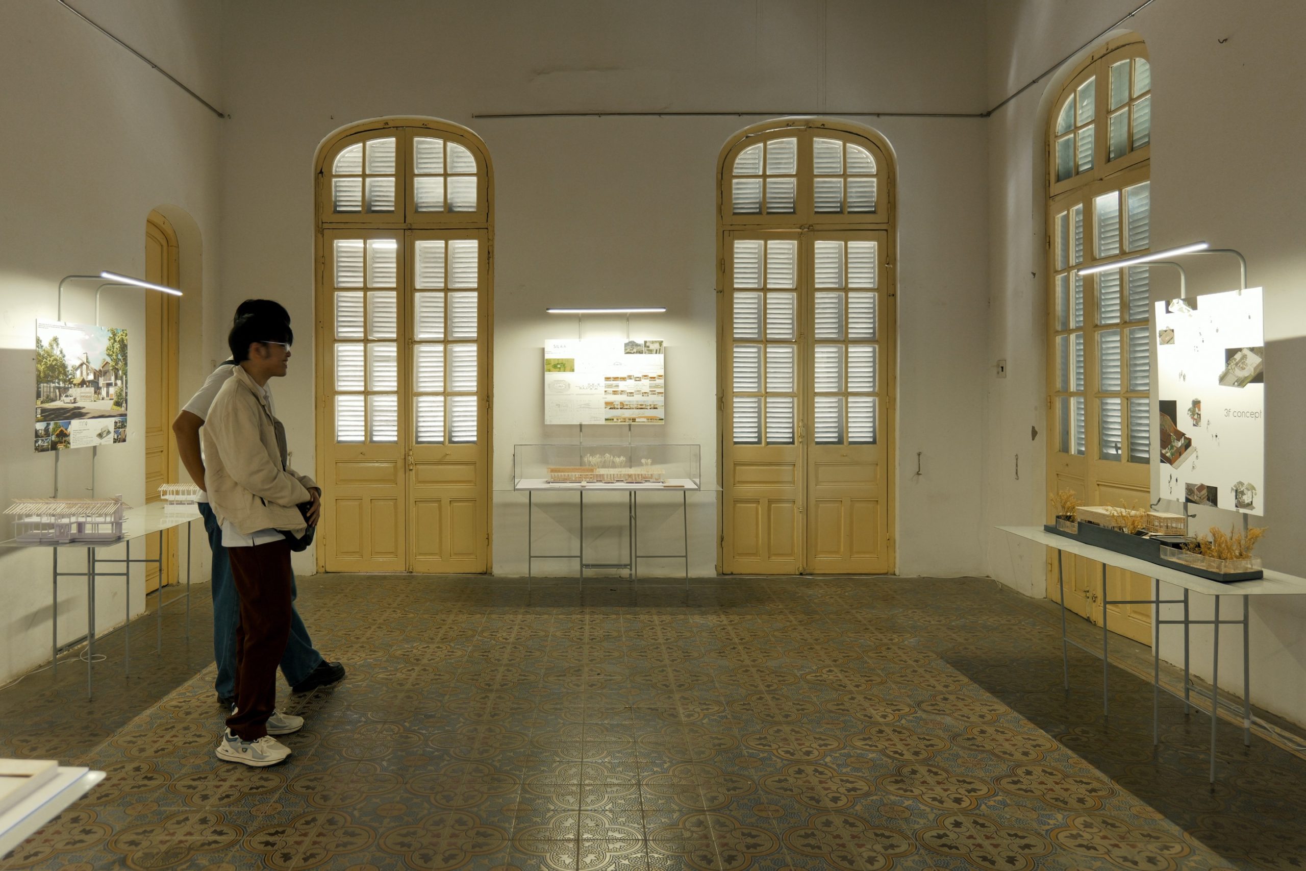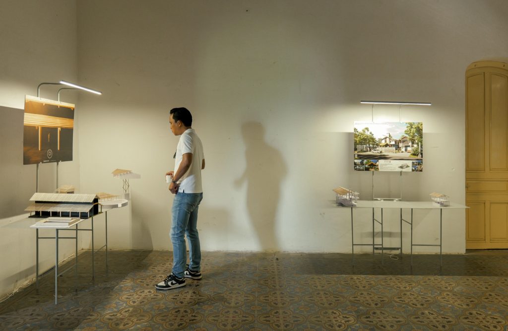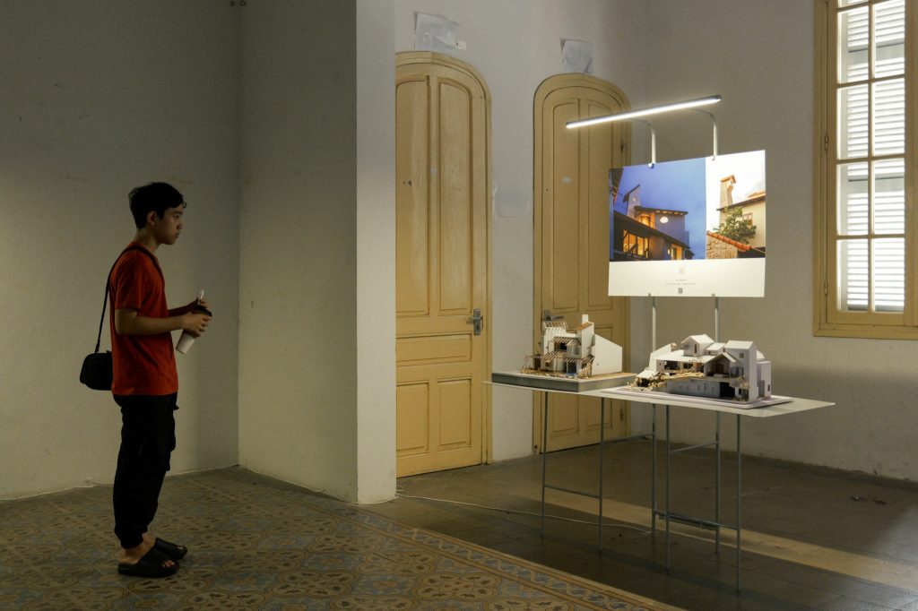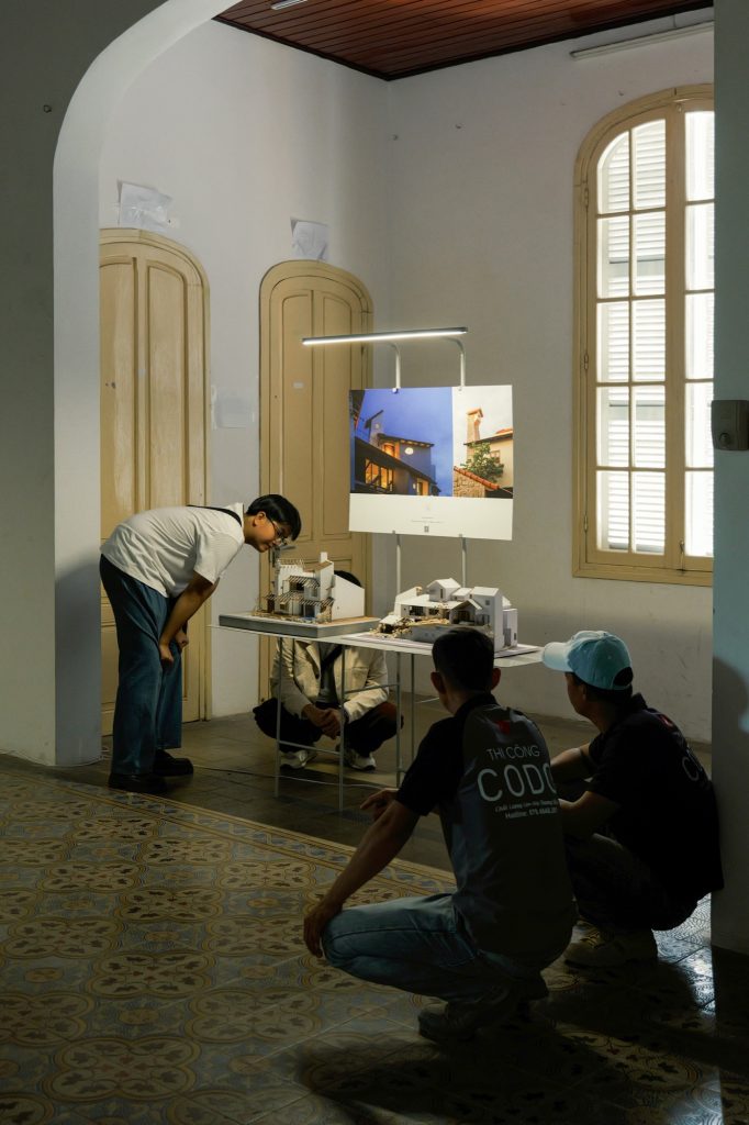 Within the framework of the PRACTISING HUE+ exhibition, cac.architects conceived a display system to present architectural models and panels contributed by participating studios. The task posed a particular challenge, as the number and specifications of the exhibits varied widely. Instead of pursuing an industrially produced solution, the architects turned to local craftsmen, choosing steel as the primary material and relying on handmade fabrication. This approach not only reduced costs but also preserved a sense of familiarity and intimacy throughout the process.