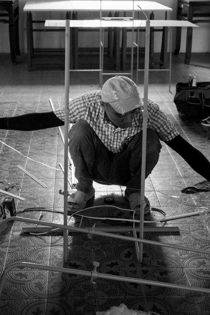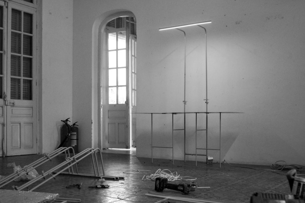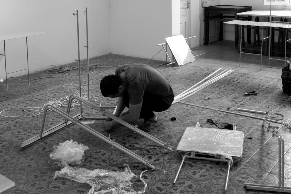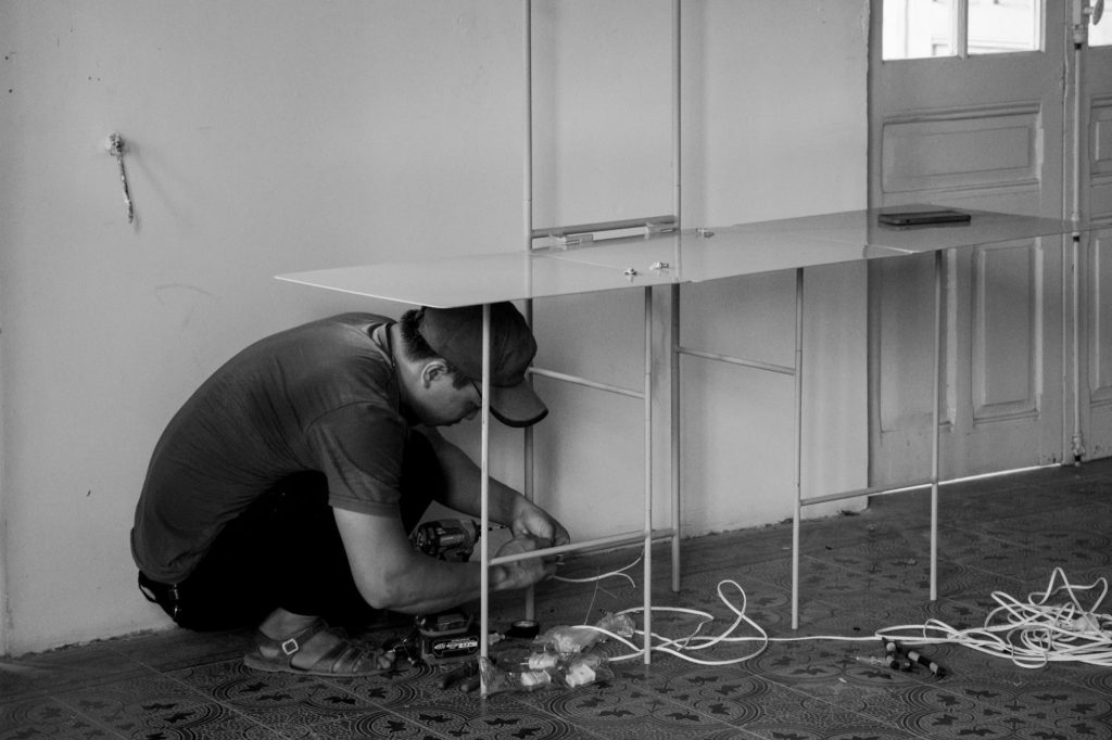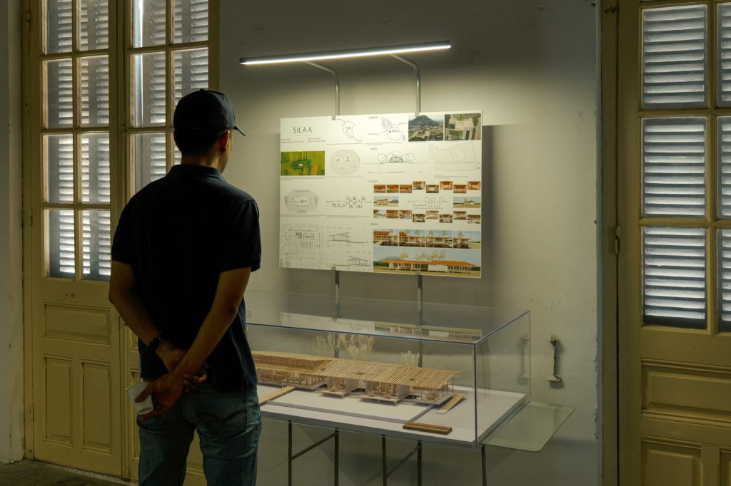 Within the framework of the PRACTISING HUE+ exhibition, cac.architects conceived a display system to present architectural models and panels contributed by participating studios. The task posed a particular challenge, as the number and specifications of the exhibits varied widely. Instead of pursuing an industrially produced solution, the architects turned to local craftsmen, choosing steel as the primary material and relying on handmade fabrication. This approach not only reduced costs but also preserved a sense of familiarity and intimacy throughout the process.