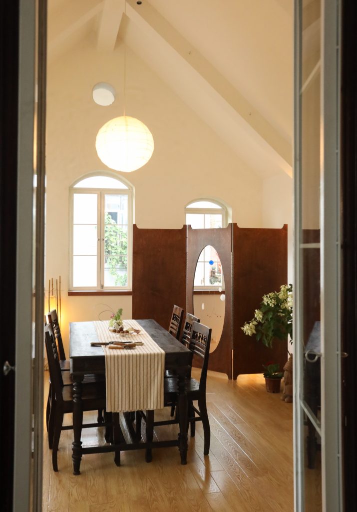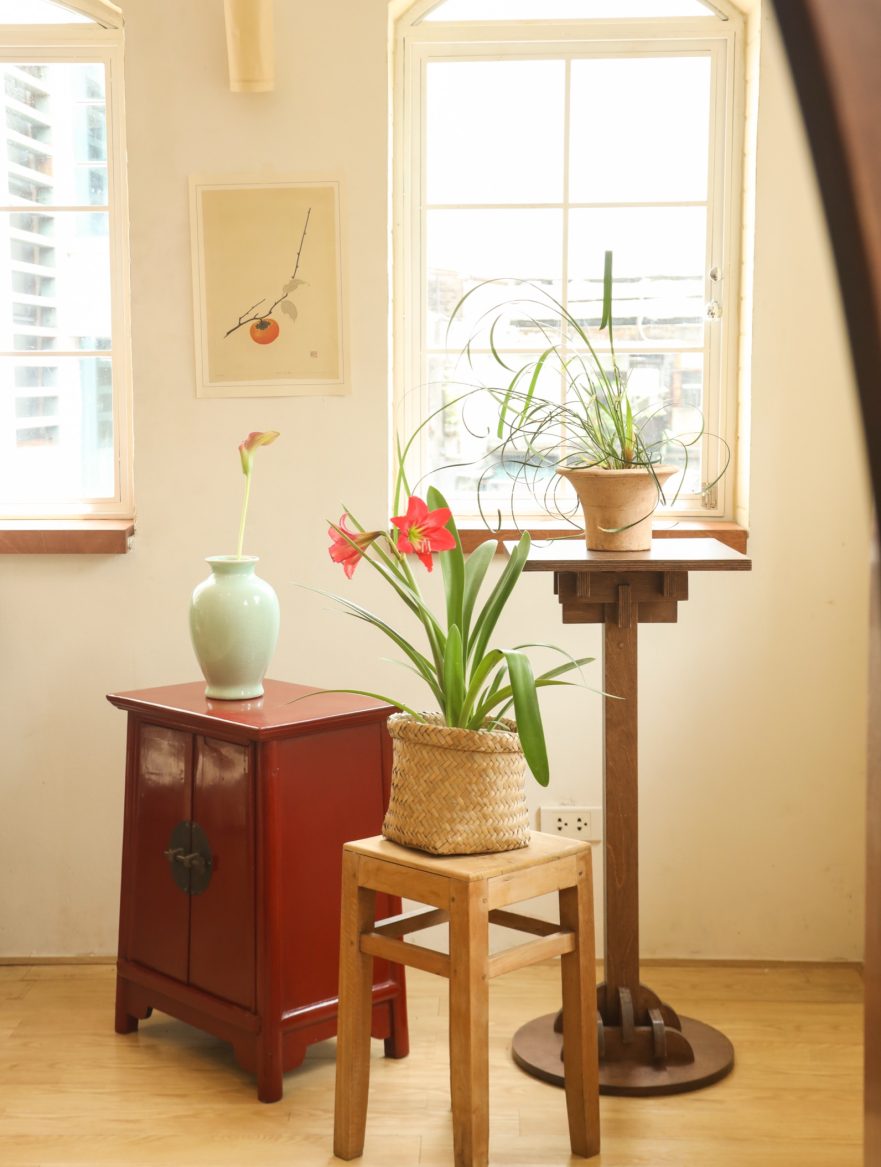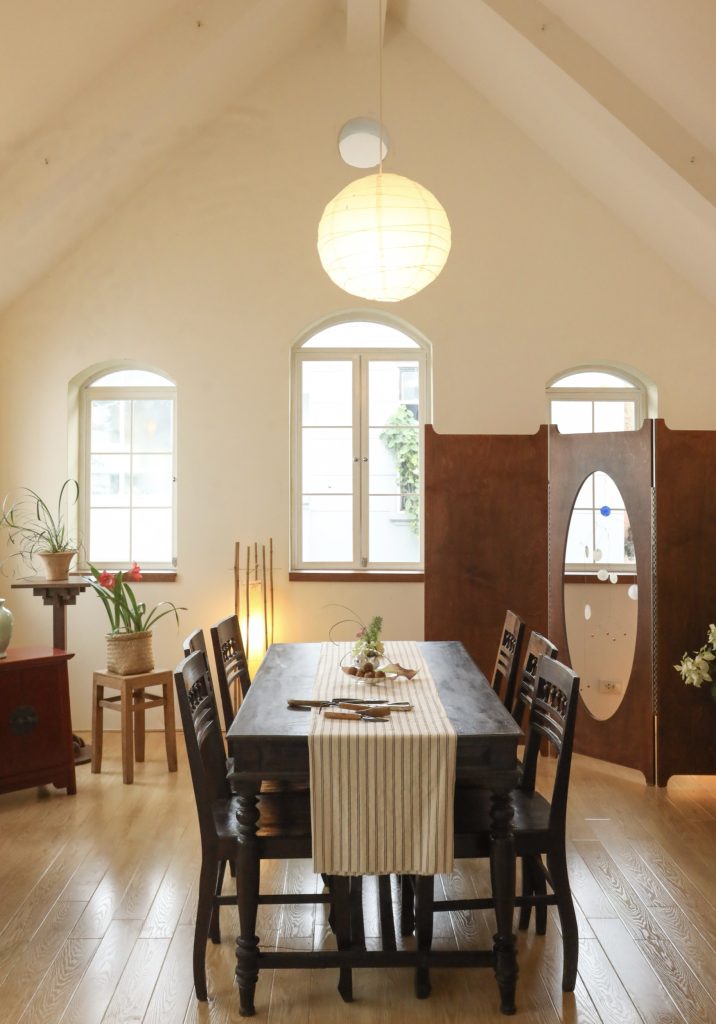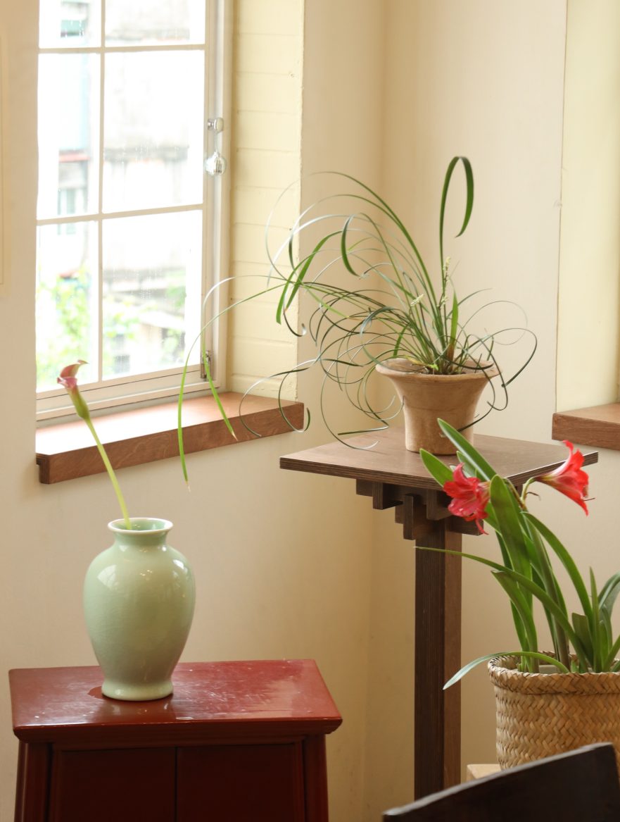 Không gian được thiết kế theo tinh thần tối giản Á Đông, hòa quyện sự mộc mạc của truyền thống Việt Nam với sự tinh tế của phong cách Scandinavian. Chiếc bàn gỗ mộc mạc ở trung tâm căn phòng như giữ nhịp cho toàn bộ không gian, xung quanh là những món nội thất được sưu tầm từ ba miền đất nước, xen lẫn những thiết kế mới chỉ vừa ra đời. Chất liệu tự nhiên như gỗ, gốm, tre, vải cùng ánh sáng chan hòa tạo nên một bầu không khí bình dị và gần gũi.