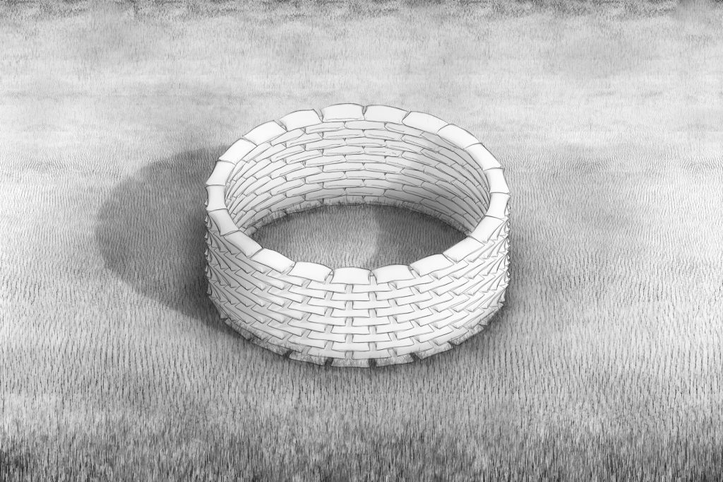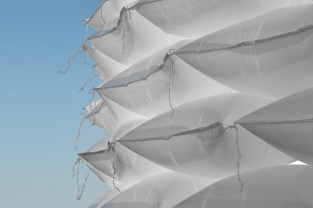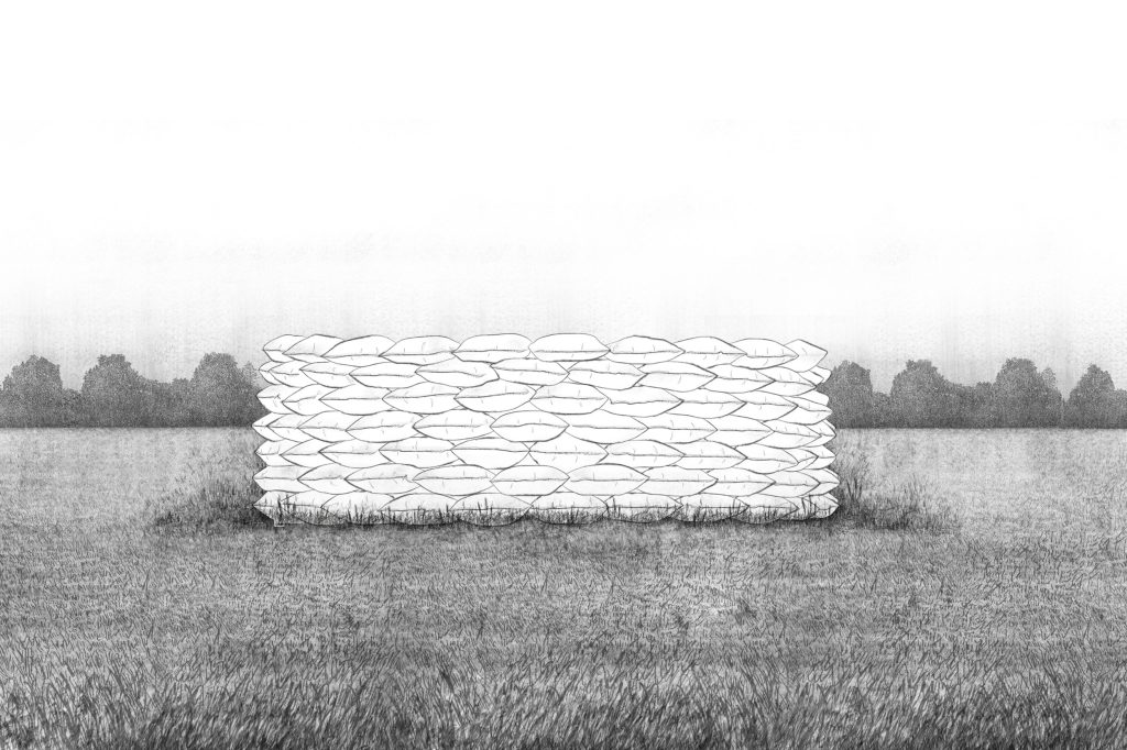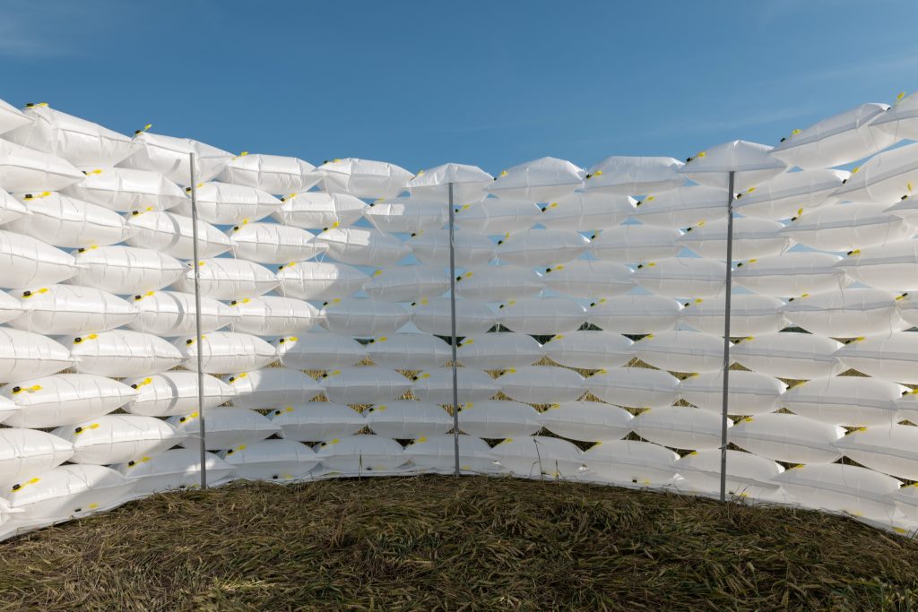 Thay vì chứa cát, các khối bao được bơm đầy không khí, trở thành những hình dạng nhẹ như gối, xếp chồng thành vòng tròn, tạo nên một không gian yên tĩnh để tạm dừng và ẩn náu. Không còn là công sự hay lũy chắn, tác phẩm trở thành một chốn trú ẩn mong manh, đặt ra câu hỏi về sức mạnh nội tại và khả năng chịu đựng của con người và văn hóa.