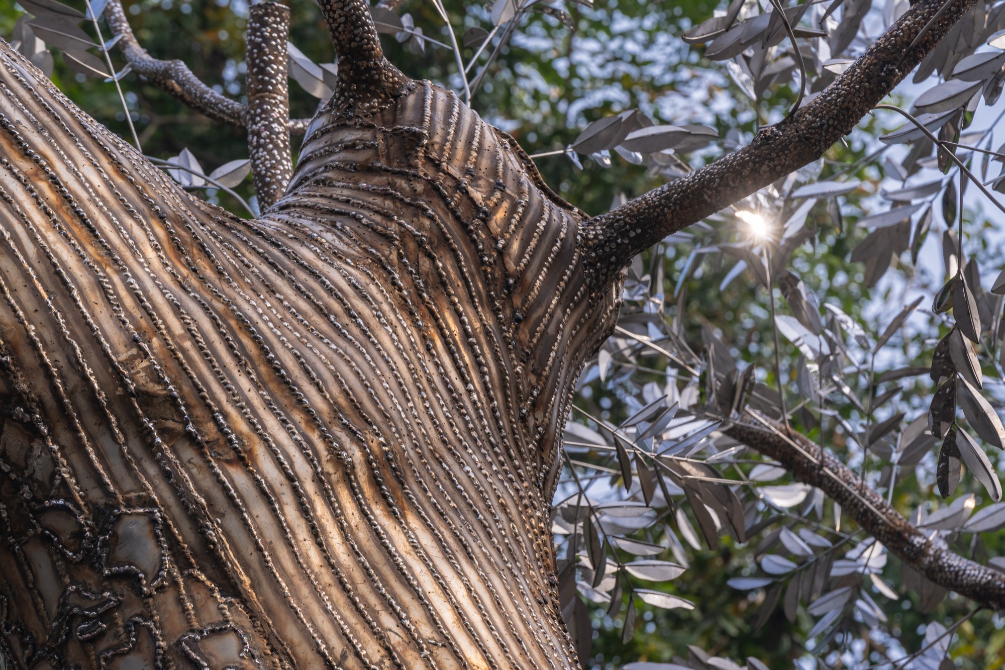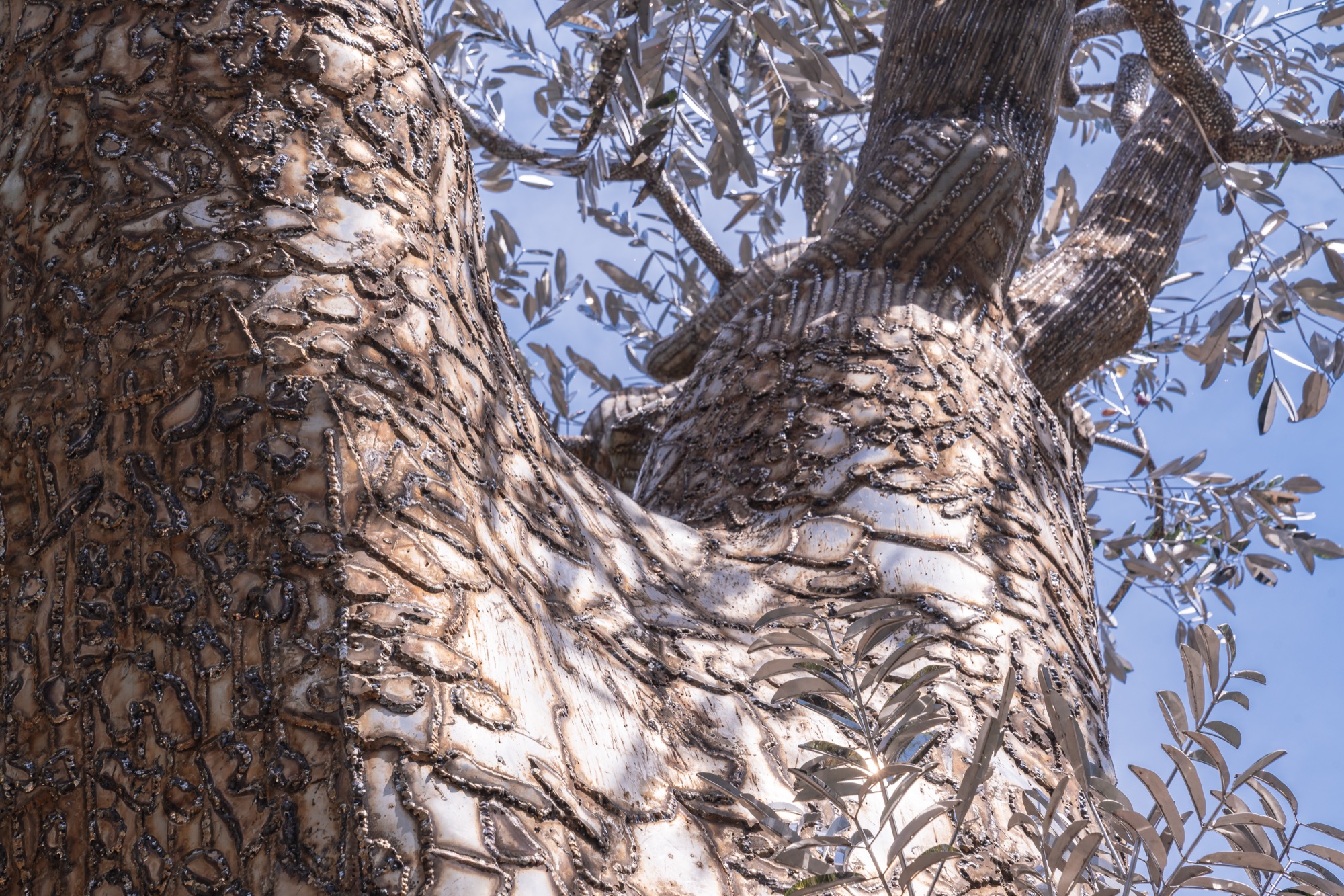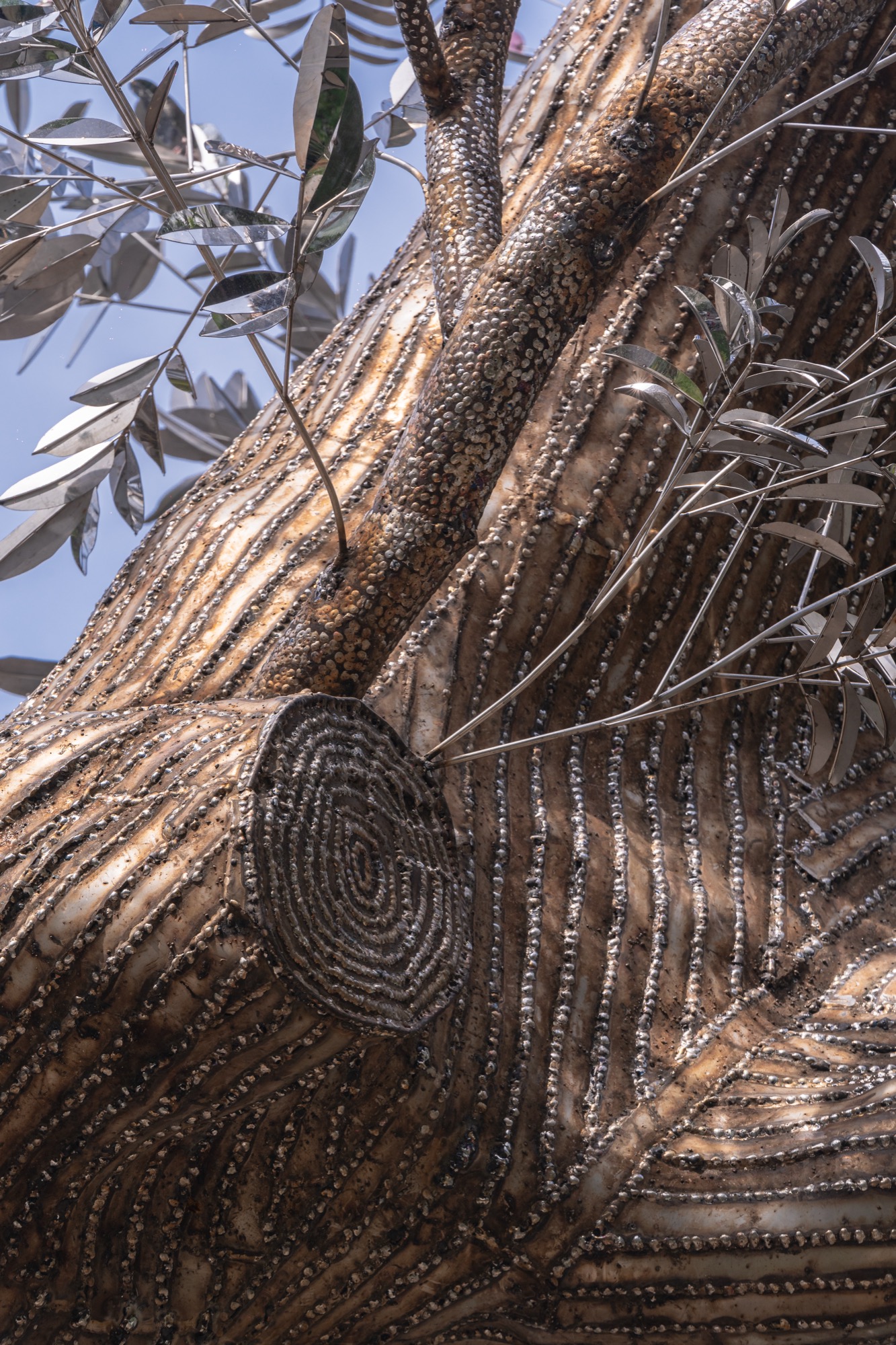 Dựa trên hình dáng nguyên gốc của cây, Tia và các cộng sự đã bao phủ lên thân cây hàng trăm tấm thép không gỉ dày 5mm, được gò hoàn toàn thủ công theo từng đường vân tự nhiên. Bề mặt kim loại vừa bóng mượt vừa gồ ghề, mô phỏng lớp vỏ cây cũ. Những tấm thép khi hoàn thiện trở thành lớp vỏ bọc ánh kim như phản chiếu lại linh hồn đã mất. Hơn 6.000 giờ làm việc liên tục, hơn 6 tấn kim loại, là con số để hoàn thiện tác phẩm này.