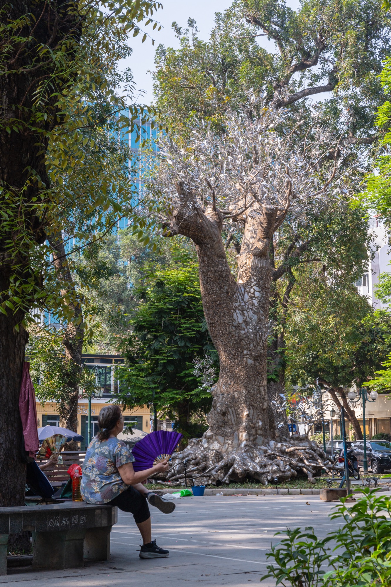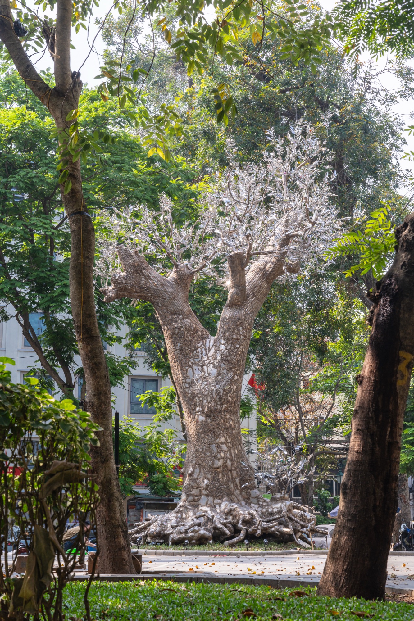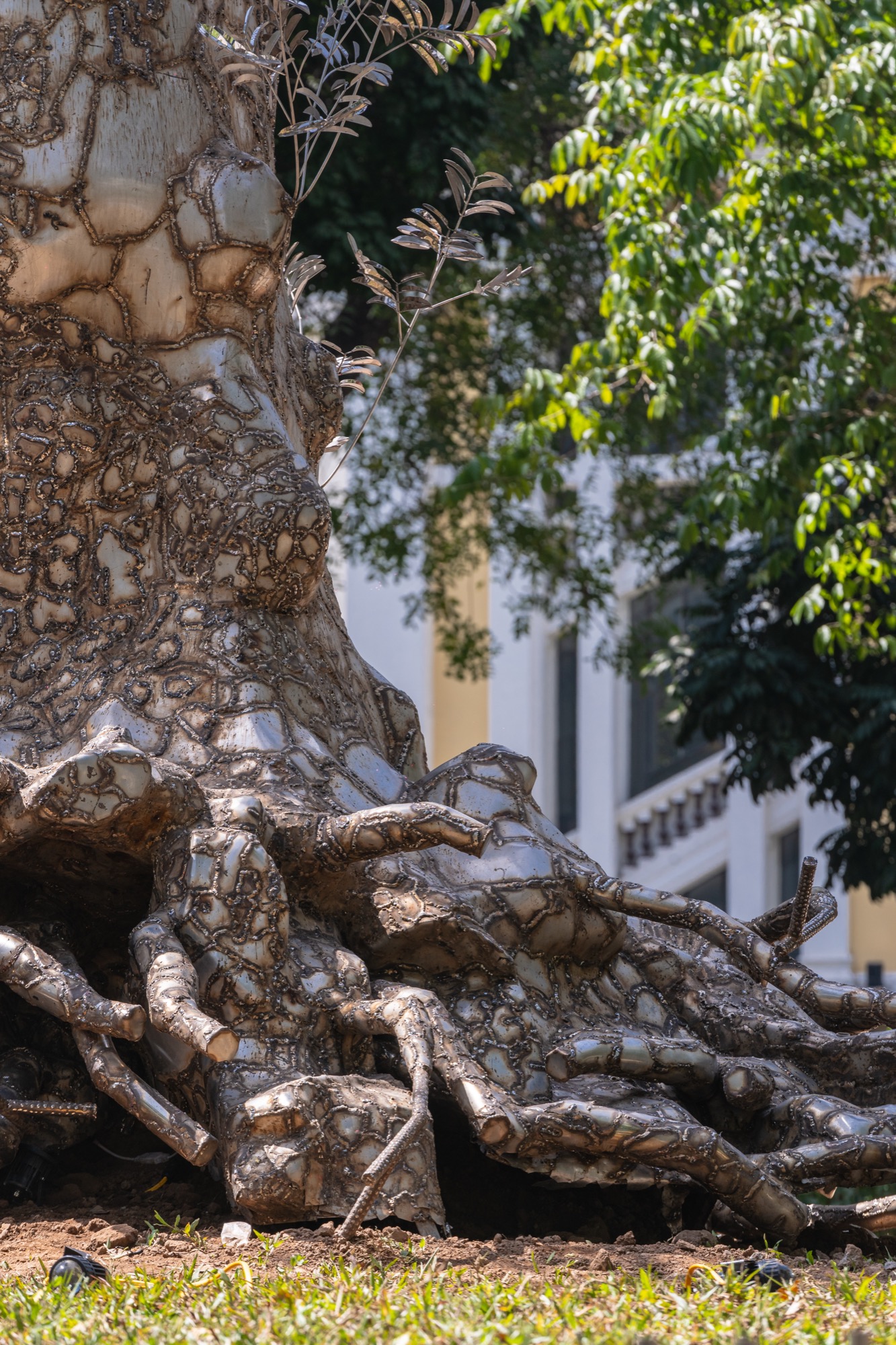 Dựa trên hình dáng nguyên gốc của cây, Tia và các cộng sự đã bao phủ lên thân cây hàng trăm tấm thép không gỉ dày 5mm, được gò hoàn toàn thủ công theo từng đường vân tự nhiên. Bề mặt kim loại vừa bóng mượt vừa gồ ghề, mô phỏng lớp vỏ cây cũ. Những tấm thép khi hoàn thiện trở thành lớp vỏ bọc ánh kim như phản chiếu lại linh hồn đã mất. Hơn 6.000 giờ làm việc liên tục, hơn 6 tấn kim loại, là con số để hoàn thiện tác phẩm này.